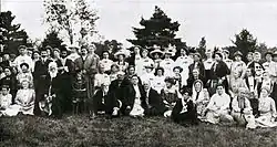 The Khans returned and he was visible in Boston by 1908.[96] That year, the first Baháʼí governing board was elected, the forerunner of the first Local Spiritual Assembly of Boston.[35][97] The community sent a delegate to the first national convention in 1909,[98] and the existence of the community was noted in a national journal.[97] The first known meeting in a public meeting space was held on November 7, 1909.[37] The following were present: Harriet Sprague, Lily Ostburg, Frances Godard, Helen Campbell, Francis Harding, Anise Rideout, Julia Culver, Raffie Esphahani, Althea Dorr, George Ostburg, Maria P. Wilson, Alice Ives Breed. On March 24, 1910, the assembly was composed of:[37] officers Harlan Ober, Grace Robarts, Julia Culver, George Ostburg, and members Mrs. H. Sprague; Mrs. F. Goddard, Alice Ives Breed, Helen Campbell, and Mrs. E. Flees. Notable speakers at events in the Boston community included Stanwood Cobb, Lua Getsinger, and Edna McKinney.[37]