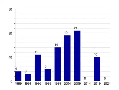 | Year | Seats contested | Seats won | +/- | Voteshare (%) | +/- (%) | |