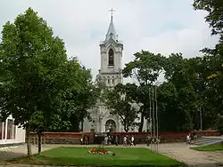 Baisogala is first mentioned in written sources in 1539 when King Sigismund I the Old established a parish with seat in the town.[3] Archeologists discovered cemeteries from the 5th and 6th centuries near the town suggesting the people inhabited the area well before the 16th century.[4] In the 17th century, the town was granted to the Radvila family and changed hands a few times. In 1791 the town was granted city privileges according to the Magdeburg law.[4] Eventually, the town was bought in 1830 by Joseph Komar, a former colonel of Napoleon Bonaparte.[3] The Komar family remained in Baisogala until 1940 when the Soviets arrested and deported the family to Kazakhstan.[3] Their large and decorated manor is quite well preserved and surrounded by 12 hectares (30 acres) of park.