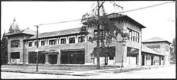 The building itself was two stories high, with square Mission Revival towers on the northeast and northwest corners.[5] The roof was red tile, and the building walls of brickwork and stone.[5] The mortar joints were wide and raked,[9] and large headers framed the windows.[5] Grueby tiles, some bearing the company's initials, decorated the exterior.[5] Total square footage was reported at between 50,000 square feet (4,600 m2)[7] and 52,000 square feet (4,800 m2).[10]