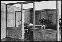 The front part of the building housed the showroom and the offices.[9] The showroom was 96 feet (29 m) wide and 36 feet (11 m) deep, and large plate glass windows looked out onto the street.[5] Rohrheimer-Brooks, Cleveland's top interior design studio,[11] designed and decorated the showrooms and associated spaces. These included a public office, large and small private office, women's toilet and anteroom, men's toilet, and separate men's and women's reception areas.[5] The showroom and offices[9] were paneled in oak stained silver-grey, although the two end walls were painted grey smooth plaster. The ceiling was open beam, and decorative crests were carved into each oak wall panel.[5] Large lighting fixtures with Frink reflectors[5][7] hung from the showroom ceiling, and the floor was covered in ceramic tile in a checked pattern with an intricate border.[7] The reception rooms were painted with a silver-grey paint to harmonize with the showroom, and the furniture, light fixtures, and most other fittings were finished to look like silver.[5][c]
