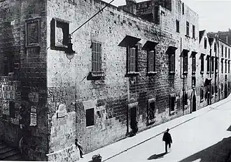The bakery of the Order was located on a city block bordered by Old Bakery, Melita, St. John and Strait streets.[46][5][33] Its main façade was in Old Bakery Street facing the Church of St. Augustine,[22][23] and it consisted of a central bay with two sloped roofs, with three-storey high sections on either side.[37] It had imposing corners, typical of Architect Cassar,[17] which were characterised by large rusticated pilasters to support the massive building.[46]