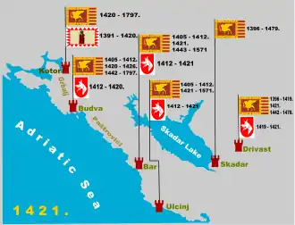 Balša waged the First Scutari War, a 10-year war, against Venice. In 1405, Ulcinj, Bar and Budva were seized by the Venetians. Balša then became a vassal to the Ottoman Turks. In 1409, however, Venice had purchased the rights to Dalmatia from King Ladislaus of Naples and began fighting for control of Dalmatian cities. After a huge effort, Balša seized Bar from the Venetians in 1412. Venice, pressed with difficulties, had no choice but to agree to return territories it had previously seized.[1] In 1413 he built a church dedicated to Saint Nicholas at the Praskvica Monastery.[2] According to a chapter Balša issued in 1417, he was probably a ktitor of the Moračnik Monastery.