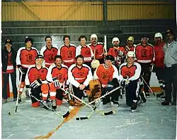 In the mid-1970s, three local young men - Lane Lemon, Paul J Scott, and Lloyd Mitchell - formed the Balaclava Burners. This team drew others from the communities of Leith, Annan, and even Owen Sound. Since the nearest year-round ice surface was in Owen Sound, practices and games were often held there, although the team also played in Keady, Chatsworth, Kilsyth, and Wiarton. Members of the team in 1987 included (from bottom left) Gary Tottenham, Joe O'Reilly, Ken Morrison, Pat Moore, and Steve Hiscox; and (from top left) Jeff Morrison (Equipment Manager), Paul J Scott, Lane Lemon, Craig Stephens, Scott Davis, Ted Van Balkom, Paul Smith, Tim Hughes, Bev Davidson, Jim Edmonstone, and Jeff Harron (managing due to suspension).