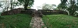 The present remains consist of the foundations of an upper fort (conserved) and a lower fort (unconserved). The upper fort located on the summit of the Balana hill consists of a quadrangular layout with three circular bastions and a narrow entrance facing the east. This section was conserved in the mid-1980s and is the most well known part of the fort. The lower fort consists of a rampart with a perpendicular retaining wall running down hill and across the road. This section is under thick vegetation and in ruinous condition. An archaeological survey has been conducted since 2017 which has resulted in producing a detailed ground plan of the site and the first LiDAR surveyed terrain map of the fort. The LiDAR survey has identified the remains of a dry ditch encircling the fort, which is not visible from the ground due to vegetation. Artefacts scattered on the surface are almost entirely of roof tile shards, indicating extensive built structures within the fort.[2][3]
