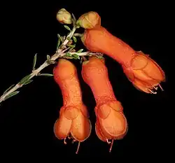 Balaustion pulcherrimum, commonly known as native pomegranate,[2] is a species of flowering plant in the family Myrtaceae and is endemic to the south-west of Western Australia. It is prostrate shrub with egg-shaped or narrowly egg-shaped leaves with the narrower end towards the base, and orange or red flowers with 15 to 35 stamens.
