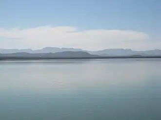 Balmorhea Lake is a reservoir on Sandia Creek 2 miles (3.2 km) southeast of downtown Balmorhea, Texas. Water from Toyah Creek, fed by the nearby San Solomon Springs, is also fed into the reservoir, as is excess water in the Phantom Lake Canal. Historians believe that people have used springs in this area for more than 11,000 years.[1] The reservoir was built in 1917 by the construction of a dam by the Reeves County Water Improvement District. The reservoir provides water for irrigation, and is a popular recreational spot for locals. Balmorhea Lake is also known as Lower Parks Reservoir.