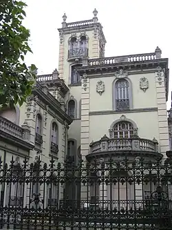 The palace was built in the early twentieth century, in 1909,[1] by the Pontevedran architect Antonio Palacios[2] for Victoriano Fernández Balsera, a wealthy merchant from Avilés.[1] The building is in the Art Nouveau style popular at the time in Catalonia.[2] One of the outstanding interior features is the V-shaped staircase opening toward the first floor. The flat roof and tower balcony afford a view of the historic city below. Originally it had massive gardens on the scale of Versailles, but only a fragment of them remains.[1]
