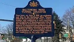 The Baltimore Mine Tunnel Disaster was an accidental explosion that occurred on June 5, 1919 just inside the mouth of Tunnel No. 2 in the Delaware and Hudson Coal Company's Baltimore Mine. The coal mine was located in Wilkes-Barre, Pennsylvania, about a mile from the center of the city. At the time, D&H employed 450 workers at the mine. Ninety-two miners were killed in the explosion, which was caused by the ignition of black blasting powder. Another 44 miners were injured, with only 7 escaping unharmed.[4]