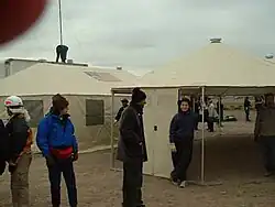 During the nights following the earthquake, the temperatures would drop to "bitterly cold" extremes, effectively killing some survivors.[27] Many of these individuals were living in unheated tents among the rubble which forced the coordinators to move thousands of families to heated[31] camps on the outskirts of Bam. Unfortunately, this action was met with some resistance and resulted in many residents to stay in place.[21] The Iranian government was, conversely, criticized for not supplying enough tents. Those that owned motorized vehicles were met with jammed traffic going both ways through Bam. Survivors loaded their belongings to move elsewhere while relief supplies, volunteers, and relatives were arriving.[23] In some areas, looters stole food from warehouses and local markets, causing the police force to react to stop further destabilization of the rescue efforts.[23]