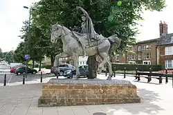 The English nursery rhyme "Ride a cock horse to Banbury Cross", in its several forms, may refer to one of the crosses destroyed by Puritans in 1600.[76] In April 2005, Princess Anne unveiled a large bronze statue depicting the Fine Lady upon a White Horse of the nursery rhyme.[78] It stands on the corner of West Bar and South Bar, just yards from the present Banbury Cross.