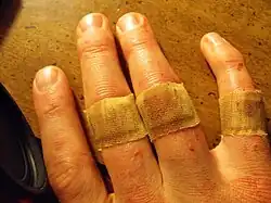 A bandage is a piece of material used either to support a medical device such as a dressing or splint, or on its own to provide support for the movement of a part of the body. When used with a dressing, the dressing is applied directly on a wound, and a bandage is used to hold the dressing in place. Other bandages are used without dressings, such as elastic bandages that are used to reduce swelling or provide support to a sprained ankle. Tight bandages can be used to slow blood flow to an extremity, such as when a leg or arm is bleeding heavily.