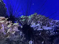 Banggai cardinalfish live in shallow lagoons in groups that include up to 500 individuals. They are often found near sea urchins, where the fish hide when threatened.[5] They are capable of hiding among the spines of sea urchins without being stung.[6] In addition to sea urchins, other living benthic substrates such as soft corals, anemones, hydrozoans, and mangrove roots also serve as microhabitats around which the cardinalfish group.[7] These groups of fish are rather sedentary, and movements between groups are observed to be very limited, especially because they feed on plankton that pass through water currents.[7][5] Such limited dispersal of Banggai cardinalfish prevents them from spreading over large geographic ranges, thus serving as a major risk of extinction along with heavy exploitation by aquarium fish collectors, as well as low fecundity.[6][8]