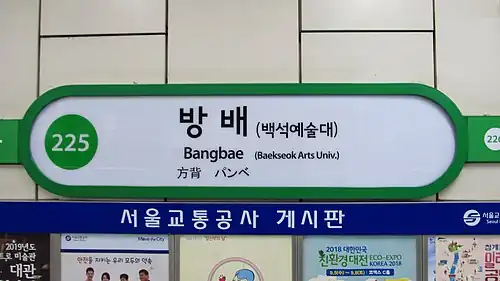 Bangbae station (Korean: 방배; Hanja: 方背), also known as Baekseok Arts University (Korean: 백석예술대) station, is a subway station on the Line 2 of the Seoul Metropolitan Subway. The station is located in the Bangbae neighborhood of Seocho District, Seoul. The tomb of Grand Prince Hyoryeong (Korean: 효령대군), the second son of King Taejong—the third monarch of the Joseon Dynasty—is located to the northeast.