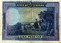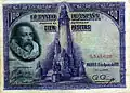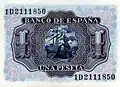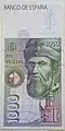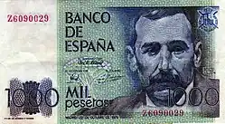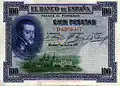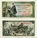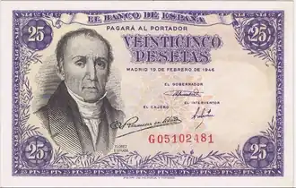 The banknotes of the Spanish peseta were emitted by the Bank of Spain in 1874–2001 until the introduction of the euro. From 1940 the banknotes were produced by the Royal Mint (Fábrica Nacional de Moneda y Timbre). In about the same year the inscription "El Banco de España" on both sides of the banknotes was temporarily changed to "Banco de España", as the definite article "el" was dropped.[1] There is no significant legislation on the copyright of the Spanish peseta banknotes and their reproductions are permitted, except for advertising.[2]