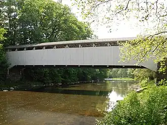 The Banks Covered Bridge is a wooden covered bridge in Wilmington Township, Lawrence County, Pennsylvania, United States.[2]: 2 It spans the Neshannock Creek southeast of New Wilmington.[2]: 2, 5 Constructed in 1889, the bridge is a Burr arch truss built on stone foundations and supported by steel girders; it is 121 feet (37 m) long.[2]: 6