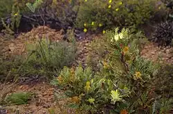 - Banksia armata (R.Br.) A.R.Mast & K.R.Thiele var. armata,[15] a shrub to 1–1.5 m (3 ft 3 in – 4 ft 11 in) high with a lignotuber and with leaves 8–20 mm (0.31–0.79 in) wide with six to thirteen lobes on each side;[4]