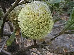 Banksia laevigata is a shrub that typically grows to a height of 1–3.5 m (3 ft 3 in – 11 ft 6 in) and has roughly flaky, grey bark but does not form a lignotuber. The leaves are serrated, broadly linear to narrow wedge-shaped, 50–140 mm (2.0–5.5 in) long and 4–20 mm (0.16–0.79 in) wide on a petiole 5–10 mm (0.20–0.39 in) long. Both surface of young leaves are hairy but become glabrous with age. The flowers are borne in spherical heads 70–80 mm (2.8–3.1 in) wide, usually on the ends of short side branches. The flowers are yellow or yellowish green and have a perianth 20–26 mm (0.79–1.02 in) long and a curved pistil 30–32 mm (1.2–1.3 in) long. Flowering occurs from September to December or from January to February and the follicles are linear to elliptical, 10–18 mm (0.39–0.71 in) long, 3–7 mm (0.12–0.28 in) high and 4–7 mm (0.16–0.28 in) wide. Each head contains up to 100 follicles surrounded by the remains of the flowers.[2][3][4]