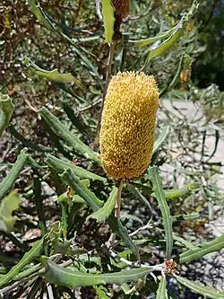 Banksia pilostylis is a shrub that typically grows to a height of 4 m (13 ft) and has hard, fissured bark but does not form a lignotuber. The leaves are serrated, narrow wedge-shaped, 50–160 mm (2.0–6.3 in) long and 5–20 mm (0.20–0.79 in) wide on a petiole 4–6 mm (0.16–0.24 in) long. The flowers are pale yellow and closely packed in a cylindrical spike 50–100 mm (2.0–3.9 in) long and 50–55 mm (2.0–2.2 in) wide with hairy involucral bracts 5–20 mm (0.20–0.79 in) long at the base of the spike. The perianth is 20–24 mm (0.79–0.94 in) long and the pistil 23–27 mm (0.91–1.06 in) long and curved. Flowering occurs from October to January and up to twenty-five elliptical follicles 22–35 mm (0.87–1.38 in) long and 10–16 mm (0.39–0.63 in) wide, surrounded by the remains of the flowers, develop in each spike. The follicles usually remain closed until the plant is killed in a bushfire.[2][3][4][5]