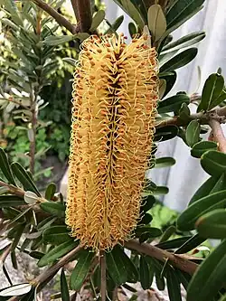 Banksia verticillata grows as a spreading, bushy shrub with many branches up to 3 m (10 ft) high, but can reach 5 m (16 ft) high in sheltered locations.[2] It may be much lower or even adopt a prostrate habit in highly exposed areas which are blasted by high wind,[2][3] or occasionally grow as a single-trunked tree. The rough grey bark has fissures, the stems and branches are finely hairy when young and become smooth with age. The leathery bright green leaves are arranged whorled, or alternately on branches, and are borne on 0.5–1.1 mm long petioles. They measure 3–9 cm (1.4–3.8 in) in length, and 0.7–1.2 cm (0.3–0.5 in) in width, and are elliptic in shape with entire (straight) recurved margins. They are initially hairy and become smooth with maturity, although their undersides remain covered with white hair.[2] The golden-yellow inflorescences appear in summer and autumn (January to April) and are 8–20 cm (3–8 in) high and 6.5 cm (2.6 in) wide. The smooth pistils are 3–3.5 cm long and hooked at the end.[4] Individual flowers open from the base of the flower spike, the wave of anthesis moving up the inflorescence. Occasionally, flowers on exposed parts may open early. It takes around 9.5 days for all flowers to open, and rates are similar during the day and night.[5] The inflorescences age to grey and the individual old flowers linger for some time before falling. Up to 100 small woody follicles may follow on old flower spikes. Measuring 1.1–1.5 cm wide, 3–4 mm wide, and jutting out 2–3 mm from the spike, they open after several years, releasing the seed.[4] Follicles more commonly appear in the middle third of the spike. The reasons for this are unknown, although timing of visits by pollinators or some anatomical factor may be relevant.[2]