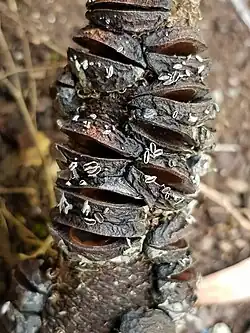 The fungus grows on dead Banksia cones, and has a distribution limited to Australia.[4] The disc-shaped fruitbodies of the fungus have dimensions of about 2–5 millimetres (0.08–0.20 in), and are light grey to dark charcoal grey. They are attached to the cones by stalks up to 5 mm (0.2 in) long.[5] Its ascospores can range in shape from elliptical to cylindrical, and have dimensions of 6–10 by 2.5–3 μm.
