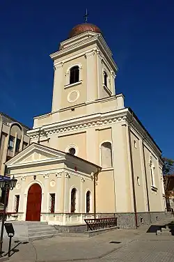Together with the parishioners, Metropolitan Iacob Stamati contributed a large sum of money for a new church;[1] he also supplied the liturgical objects.[2] An architect was hired from Transylvania,[1] building a structure in the classic Russian style. This appears to be the oldest church in Iași that mentions the architect's name on the inscription: Herr Leopold.[2] The carved linden iconostasis is the work of Eustație Altini, who also painted it in 1802. Early the following year, he began painting the church interior, but the work remained incomplete upon Stamati's death that March. In his will, the metropolitan specified that the church would not be subject to foreign control. The foyer of the present church is where the altar of the previous church was, and its dedication was changed to All Saints' Day.[1] The church is in trefoil plan, with side apses on the interior and a semicircular altar apse. There is a bell tower above the narthex; its Baroque style is common to the region. The original structure has not been modified, only repaired.[2]