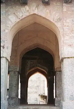 It has been inferred that the twelve pillared square monument may have been a tomb chamber with arcades around it, originally intended as Chausath Khamba. The Lalmahal, now in ruins and partially demolished, is a red sandstone monument behind Barakhamba.[4]
