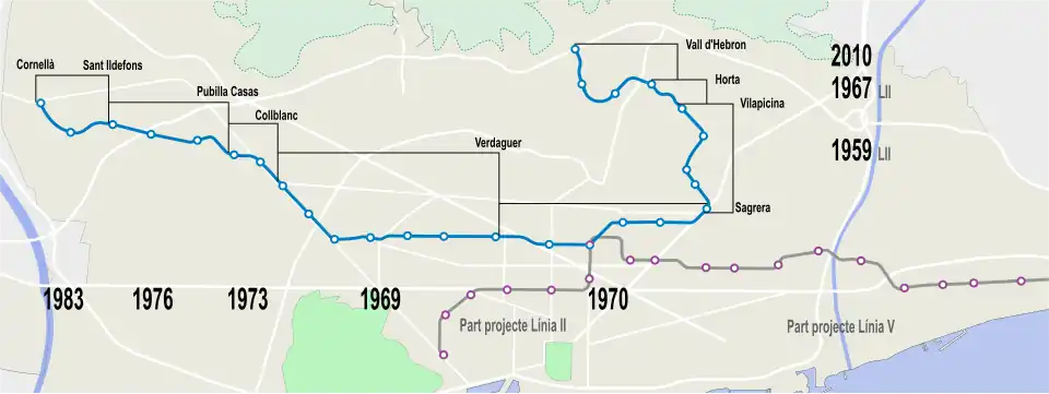 A separate project, known as Transversal Alt or Line V would open in 1969, with the initial section running from Collblanc (then known as Sant Ramon) to Diagonal. In 1970, the line would be extended from Diagonal to La Sagrera, with Line II merging into Line V.[4] The line was expanded towards Hospitalet and Cornellà in the 1970s, with an extension to Pubilla Cases opening in 1973 and a further one to Sant Ildefons in 1976. The line would reach its current terminus in Cornellà Centre in 1983.[5]