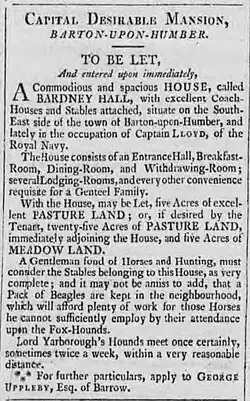 The Uppleby family retained ownership of the property for many years. Their principle residence was Barrow Hall and for some time they rented the house to wealthy tenants. A rental notice for 1808 is shown. Sarah and George had two sons and the eldest Charles Uppleby (1780-1853) inherited Bardney Hall when his father died in 1816. However he did not move there but continued to live at Barrow Hall. Instead his younger brother Reverend George Uppleby (1789-1852) who was the vicar of Barton-upon-Humber lived there with is his wife Mary Fox (1796-1857).[5][6]