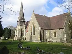 The earliest known record of the Church of England parish church of Saint James[7] dates from 1220.[4] The ancient church was pulled down in 1860[3] and the present church building was built in 1860–61[6] or 1862.[4] The ancient church door remains in the garden of Weston House in Wokingham.[3] The new church was designed in a 13th-century Gothic Revival style[4] by the architects J.B. Clacy and Son[6] of Reading.[8] The chancel and transepts were added[6] or rebuilt[4] in 1887. The building retains two features from the earlier church: a late 13th-century wooden memorial effigy of a woman, thought to be that of Mistress Agnes Neville, daughter of a lord of the manor in the 14th century,[3] and the late 18th-century baptismal font.[6] The bell-tower has a ring of four bells cast in 1863 by John Warner and Sons[9] of Cripplegate in the City of London.[10]
