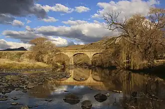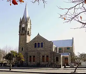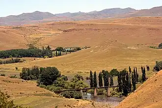 Barkly East (Afrikaans: Barkly-Oos) is a town in Eastern Cape Province, South Africa, seat of the Joe Gqabi District Municipality, and 117 km by road E.S.E. of Aliwal North, lying in the mountainous area just south of Lesotho. The town lies at the southern tip of the Drakensberg on the Langkloofspruit, a tributary of the Kraai River which, in turn is a tributary of the Orange River at an elevation of 1 790 meter (5 873 foot) above sealevel. Barkly East is characterized by rugged mountains and green valleys. Snow falls in winter, and the hamlet of Rhodes is 60 km or an hour's drive from Barkly East on the R396. Both are within the boundaries of the Senqu Local Municipality.