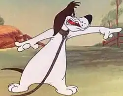 Dawg, called "Mandrake," was cast as a pet of Porky Pig in 1947's One Meat Brawl, where the pair pursue one-shot star Grover Groundhog, who gives the hunting dog a sob story ("Wife and 72 children!...No coal in the cellar...!") that has him weeping sympathetic tears, much to Porky's disgust.[9] Dawg/Mandrake uses this ploy himself in 1949's Daffy Duck Hunt, where, still Porky's pet and hunting companion, he persuades Daffy Duck to play along at being captured so he can avoid punishment from Porky, promising to free the duck later. However, once Daffy is tucked into Porky's freezer, Mandrake goes back on the bargain, although Daffy has little trouble outwitting both him and Porky. Although Dawg usually sports a gruff New York City accent in the Foghorn Leghorn shorts, in Daffy Duck Hunt he speaks mostly with a Southern accent (only one line, "I'll fix that dirty duck!", is rendered in his usual voice). Another character who resembles Dawg (known as Geo R. Dog) would also appear in the 1951 Goofy Gophers cartoon A Bone for a Bone.