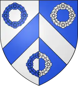 ![]() ![]() Escutcheon: Per pale argent and azure, on a chevron between three chaplets of roses counterchanged. Crest: A falcon belled Or preying on a mallard Proper. Supporters: On either side a falcon wings expanded belled Or gorged with a chaplet of roses Azure. Motto: Who Dares Wins. Badge: A rose Gules barbed seeded leaved and slipped between two branches of laurel in saltire Proper enfiled with a baron's coronet Or. | |