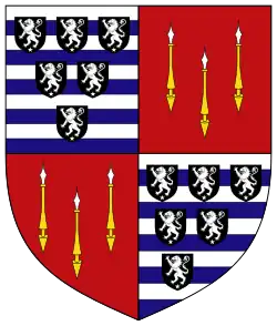 The heraldic blazon for the coat of arms of the barony is: Quarterly: 1st and 4th, barry of ten argent and azure, six escutcheons three two and one sable each charged with a lion rampant argent, a mullet for difference (for Cecil); 2nd and 3rd, gules three tilting spears two and one or headed argent (for Amherst).