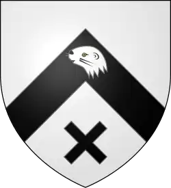 Argent, on a chevron sable, an otter's head erased of the first, in base a saltire couped of the second