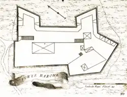 Since at least the mid-16th century, the city rectors and envoys had been stressing the need for the construction of fortification objects on the hills north of the city, because the city walls and St. Michael's Fortress had not been built to endure any prolonged artillery attack.[4] The pleas were constantly rejected by the Venetian senate due to lack of funds. In the spring of 1646, one year after the Cretan War broke out between the Venetians and the Ottomans, the Bosnian pasha began to amass a large army for the attack on Dalmatia.[5] At the same time, a German nobleman in Venetian service, Baron Christoph Martin von Degenfeld, took over the defense of the city, and a Genoese military engineer, Father Antonio Leni, arrived in Šibenik and made sketches for the necessary improvement of the city's defense.[6] When the people of Šibenik renewed their request for protection, the Venetians denied them the funds once again, but the citizens were not explicitly forbidden from building the fortification by themselves.[7] Upon hearing that, they took the matter into their own hands – the construction of both Barone Fortress and the adjacent St. John's Fortress began on 1 August 1646, and both fortresses were successfully built in only 58 days.[8] The first Ottoman siege in October 1646 was fended off after just seven days.[9] The fortresses were strengthened over the following winter and prepared for the next attack. On 17 August 1647, the Ottoman commander, Techieli-pasha, arrived in Šibenik with the largest invading army in Dalmatia since the Roman era – 25,000 soldiers and heavy artillery. After a ferocious one-month siege, the enemy withdrew with great losses in both manpower and equipment.[10] Turkish invaders were forced to retreat to the interior, towards Drniš, and never managed to conquer Šibenik.[11]