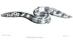 The barred conger is a slender, nearly cylindrical elongated fish which becomes laterally compressed towards the tail. It grows to a length of about 60 centimetres (24 in) and has robust pectoral fins. It has large gill slits immediately in front of the pectoral fin origins. It has between 154 and 159 vertebrae and a long, narrow dorsal fin that runs almost the whole length of the body. The small caudal fin is stiffened and adapted for rapid reverse burrowing into the substrate. The barred conger has a well-developed lateral line and no scales. It is a whitish fish with about twelve irregular dark brown bars on the body and many small dark spots on the head. The dorsal fin has further prominent barring and spotting.[2][3]