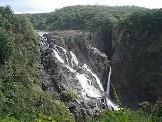 The river's catchment area includes the major tributaries flowing into Lake Tinaroo including Kauri, Mazlin, McLean, Maroobi, Peterson and Severin Creeks. It also absorbs most of the major tributaries on the Atherton Tableland, including Emerald Creek, Granite Creek, the Clohesy River and Stoney Creek.[7] This also includes Thomatis Creek, which has only been connected to the Barron since 1932 and has been responsible for diverting part of the flow from the river. Freshwater Creek joins the Barron River below the Gorge and drains Lake Morris and the Lamb and Whitfield Ranges.