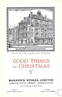 Barrow's Stores was originally started by Richard Cadbury, of the Cadbury family. Richard opened a small drapery store in 1794 in Bull Street.[1] By 1824 the Cadbury family opened a new shop next door selling tea, coffee and cocoa.[1]