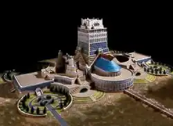 The Oriental village by the sea "is based upon Oriental building types arranged in a plan originating in patterns of insect and plant life. The exoskeleton of a dragonfly forms the main body of the building’s layout, its triangular mouth of stairs on the waterfront leading to the creature’s circular head of the entrance lobby. The insect’s long segmented yellow body is the central corridor, dome-lit, which intertwines with a branch of a tree, its stem a road and its leaves the roofs of condominiums and leisure facilities. The colourful berries are cone-topped villas intended to be reminiscent of Chinese temples."[1]