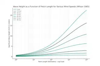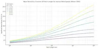 In 1965, Wilson proposed a method which can be used to approximate the significant wave height H1/3 and period T1/3 of wind waves generated by a constant wind of speed U blowing over a fetch length F.[13][14] The units for these quantities are as follows: