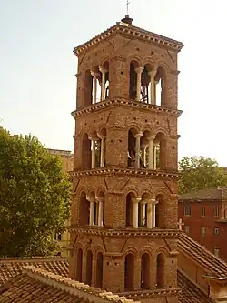 The Romanesque architecture and belltower was added in the early thirteenth century. Restorations of 1388 by Francesco da Volterra, pursuant to order of the former Camerlengo of the Holy Roman Church, Cardinal Enrico Caetani who transformed the three naves into one and a dome was added that Francesco da Volterra also designed. The painting of Angels and Saints before the Savior in the interior of the dome is a fresco by Pomarancio. During these last restorations some fragments of a Laocoön group were found that were larger than those in the Vatican City. Because none was willing to pay extra for this find, the hole in the ground was filled. These fragments were never recovered. The façade was renewed in 1870 and Pietro Gagliardi added frescoes.