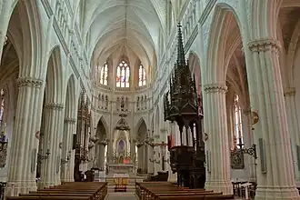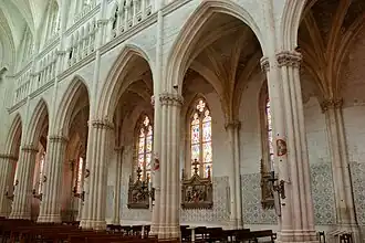 The inside of the church is big. There are tall fluted pillars with pointed arches and a small carved frieze at the top of the pillars. Above is arcading with round pillars, round arches and windows above. The ceiling is vaulted with roof bosses. At the back of the south aisle is a stone font. Three pillars support a carved spire with pinnacles above the font. The ambulatory is separated from the choir by pillars and pointed arches. It has three apses, each with an altar. The chancel has a crucifix on the walls and a painted statue of the Virgin surrounded by children.