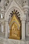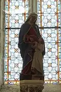 The south apse has a fairly simple altar with Saint Anne and the young Mary. The central apse has an altar with carved figures on the base of adults bringing children to the Virgin. The retable has angels, spires and Biblical scenes, including the raising of Jesus's daughter from the dead. Above the retable is a huge statue of the Virgin standing on a rock with young children, lit up by light bulbs. The walls around the altar are covered with Merci plates. The altar in the north apse is fairly plain with a statue of Saint Joseph and the young Jesus. The north chancel altar is carved from stone with carvings of angels on the base and carved leaves around the top of the altar and along the shelf. There is a statue of Mary and Joseph on the host box.