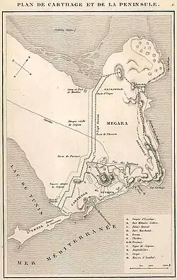 In 1901, Paul Monceaux referred to the disagreement between historians "on the number and location of basilicas".[5] Victor de Vite locates two Cyprian basilicas outside the city walls of Carthage,[6] the place of his martyrdom and the place of his burial at "Les Mappales". Monceaux considered that three buildings were dedicated to the saint in Carthage, two outside the city (Ager Sexti towards La Marsa, and the other near the cisterns of La Malga) and one near the Punic ports,[7] a thesis contested by most specialists, including Lancel. Texts by Augustine of Hippo, in particular his sermons, support the idea of two buildings dedicated to the bishop of Carthage.[4]
