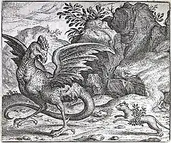 ![]() Woodblock print of a basilisk from Ulisse Aldrovandi, Serpentum, et draconum historiae libri duo, 1640 | |