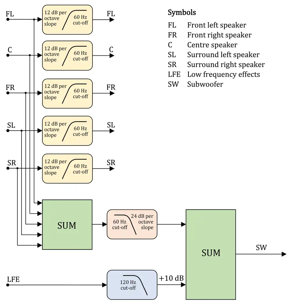 The high-pass filters applied to each of the main channels are typically 12 dB/octave and use a Butterworth filter. These are complemented by a 24 dB/octave low-pass filter in the subwoofer feed, which typically uses a Linkwitz-Riley filter topology. This approach takes into account the natural low-frequency responses of the main speakers, which roll off at 12 dB/octave for sealed enclosures, and 18–24 dB/octave for vented enclosures. The aim is to have the low-pass filtered and high-pass filtered signals be −6 dB at the crossover frequency, producing what is known as an acoustical 4th-order Linkwitz-Riley alignment of reasonable accuracy. This helps to ensure that the low-frequency response of each of the main channels is extended downwards with a flat acoustical response.[3] In the diagram, a 60 Hz crossover frequency has been illustrated, but this can typically vary between 40 and 80 Hz.