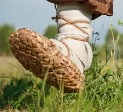 Bast shoes have been worn since prehistoric times. Wooden foot-shaped blocks (lasts) for shaping them have been found in Neolithic excavations, e.g. 4900 years old.[1] Bast shoes were still worn in the Russian countryside at the beginning of the twentieth century. Today bast shoes are sold as souvenirs and sometimes worn by ethnographic music or dance troupes as part of their costume.