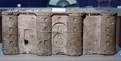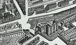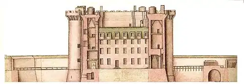 Structurally, the late-18th century Bastille was not greatly changed from its 14th-century predecessor.[89] The eight stone towers had gradually acquired individual names: running from the north-east side of the external gate, these were La Chapelle, Trésor, Comté, Bazinière, Bertaudière, Liberté, Puits and Coin.[90] La Chapelle contained the Bastille's chapel, decorated with a painting of Saint Peter in chains.[91] Trésor took its name from the reign of Henry IV, when it had contained the royal treasury.[92] The origins of the name of Comté tower are unclear; one theory is that the name refers to the County of Paris.[93] Bazinière was named after Bertrand de La Bazinière, a royal treasurer who was imprisoned there in 1663.[92] Bertaudière was named after a medieval mason who died building the structure in the 14th century.[94] Liberté tower took its name either from a protest in 1380, when Parisians shouted the phrase outside the castle, or because it was used to house prisoners who had more freedom to walk around the castle than the typical prisoner.[95] Puits tower contained the castle well, while Coin formed the corner of the Rue Saint-Antoine.[94]