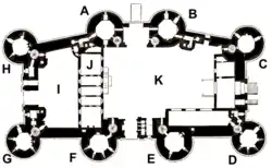 Plan of the Bastille in the 18th century. A – La Chapelle Tower; B – Trésor Tower; C – Comté Tower; D – Bazinière Tower; E – Bertaudière Tower; F – Liberté Tower; G – Puits Tower; H – Coin Tower; I – Courtyard of the Well; J – Office wing; K – Large Courtyard